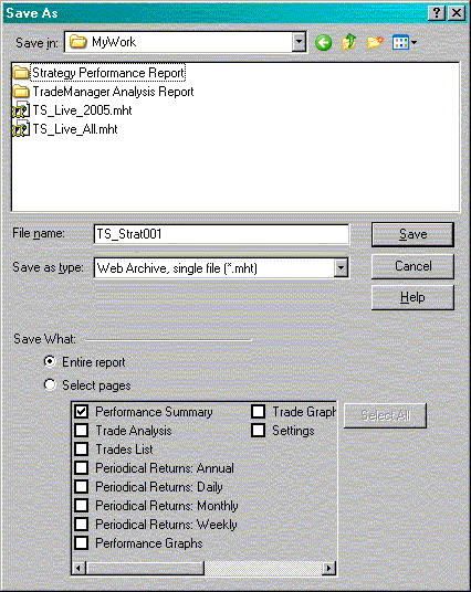 Performance Analyzer": 1. Open the "Trading Performance Analyzer" 2. File/Open (or Ctrl+O) 3. Navigate the MyWork folder (were we exported the data) C:\Program Files\TradeStation 8.xxxx\MyWork 4. select the newly created File (i.e. TS_Strat001.mht) 5. Click on the OPEN button |